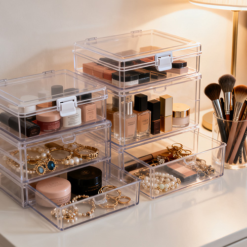 সৌন্দর্য এবং ত্বকের যত্ন: পিসি ট্রান্সপারেন্ট স্টোরেজ বক্স লিপস্টিক, আই শ্যাডো এবং মেকআপ ব্রাশ রাখার জন্য ব্যবহার করা হয়। এটি একটি মাল্টি-লেয়ার ড্রয়ারের কাঠামোর সাথে ডিজাইন করা যেতে পারে। উপরের স্তরটি নিয়মিত সরবরাহের জন্য ব্যবহৃত হয়, এবং নীচের স্তরটি পণ্য সংরক্ষণের জন্য ব্যবহৃত হয়; পার্টিশন সহ ছোট স্টোরেজ বক্সটি বিশৃঙ্খল এড়াতে চোখের কালো এবং আইলাইনার কলমের মতো লম্বা এবং পাতলা আইটেমগুলি সাজানোর জন্য ব্যবহার করা হয়।